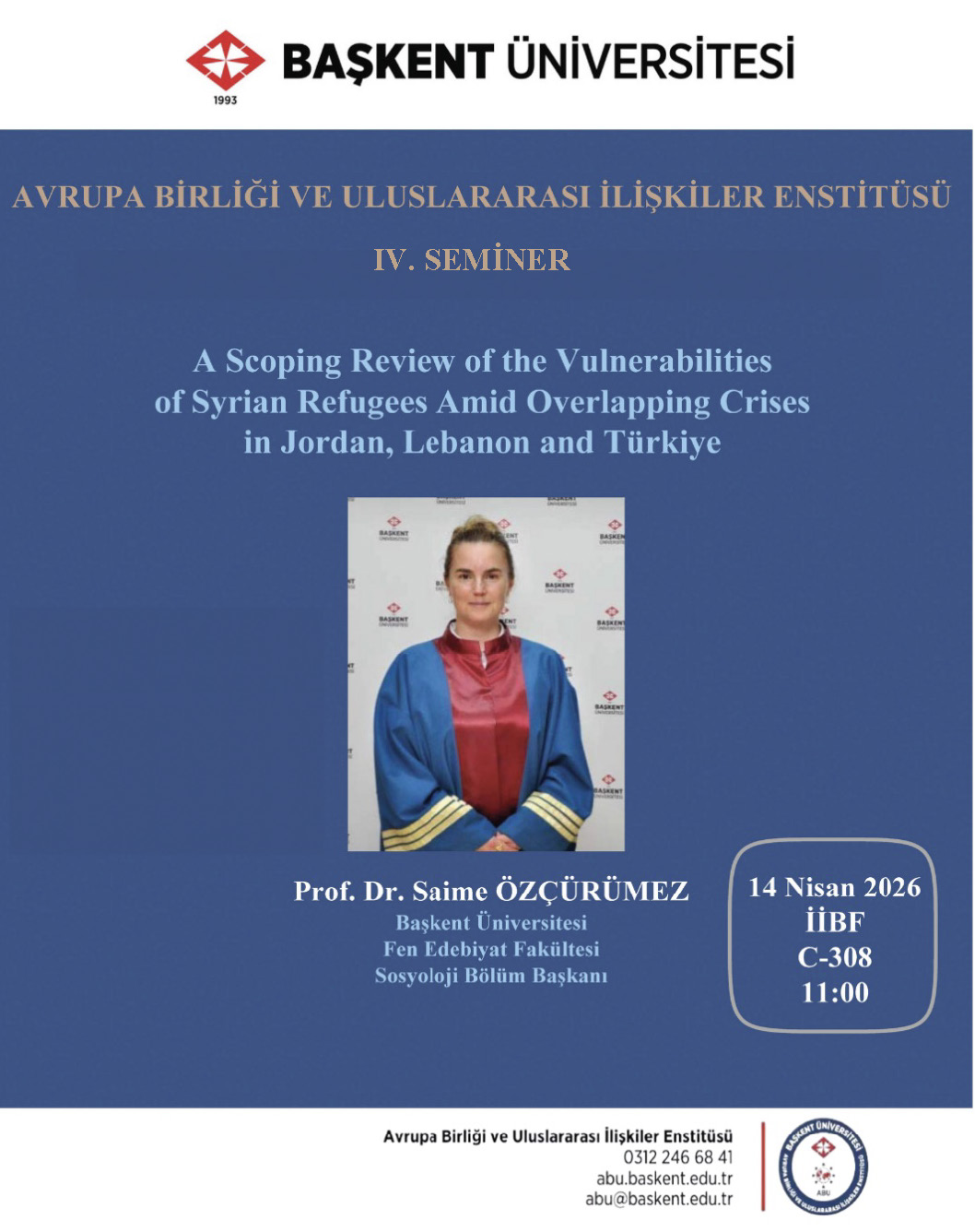 Başkent Üniversitesi Fen Edebiyat Fakültesi Sosyoloji Bölüm Başkanı Prof. Dr. Saime Özçürümez hocamızın katılımıyla "A Scoping Review of the Vulnerabilities of Syrian Refugees Amid Overlapping Crises in Jordan, Lebanon and Türkiye" başlıklı yayınlanmış makalesi üzerinden Suriyeli mültecilerin Ürdün, Lübnan ve Türkiye ekseninde kesişen yaşanmış ve yaşanmakta olan krizleri hakkında konuşacaklardır. -detaylı bilgi için-